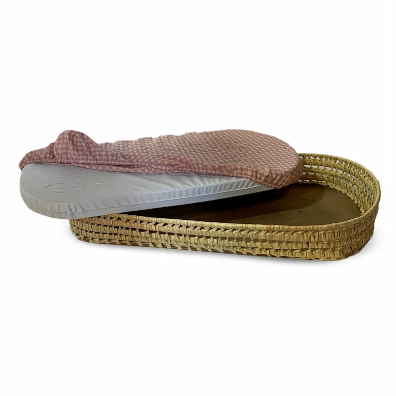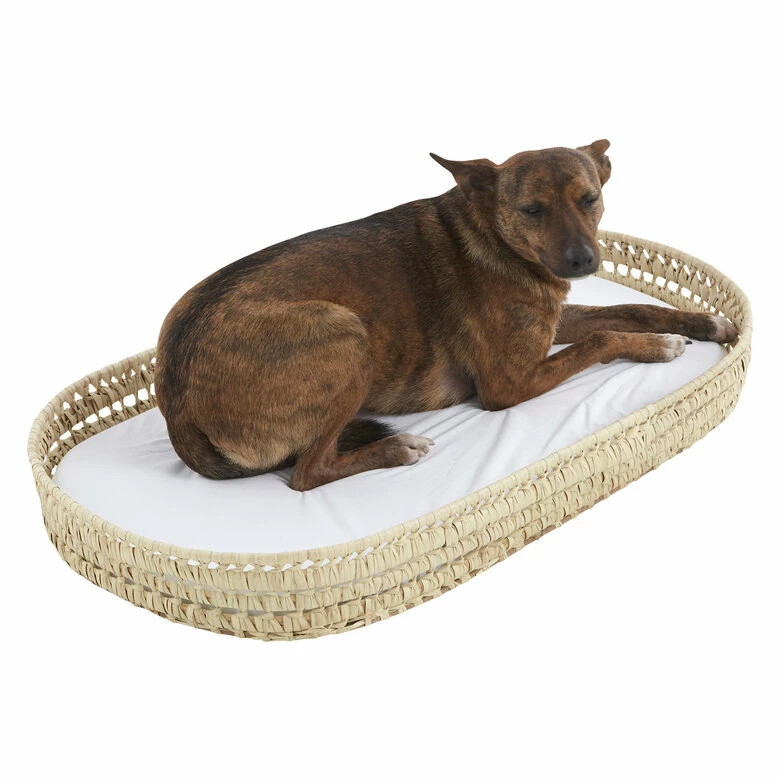 - Cama chic para mascota con estructura ovalada de palma natural. Incluye colchón y funda de colchón con ajuste elástico.