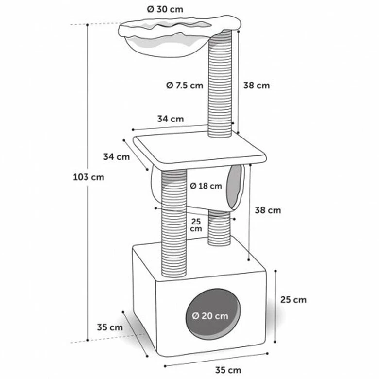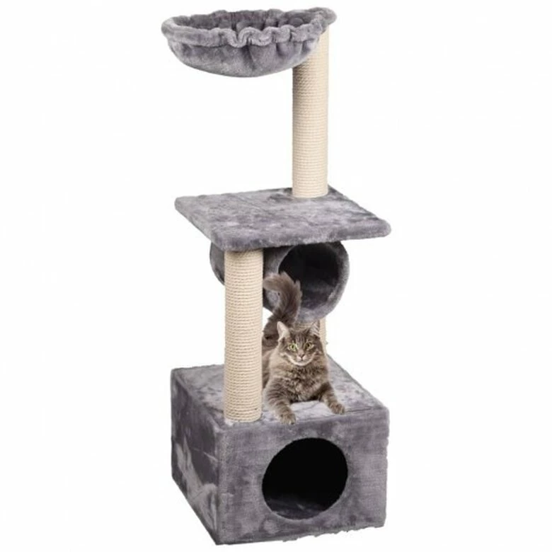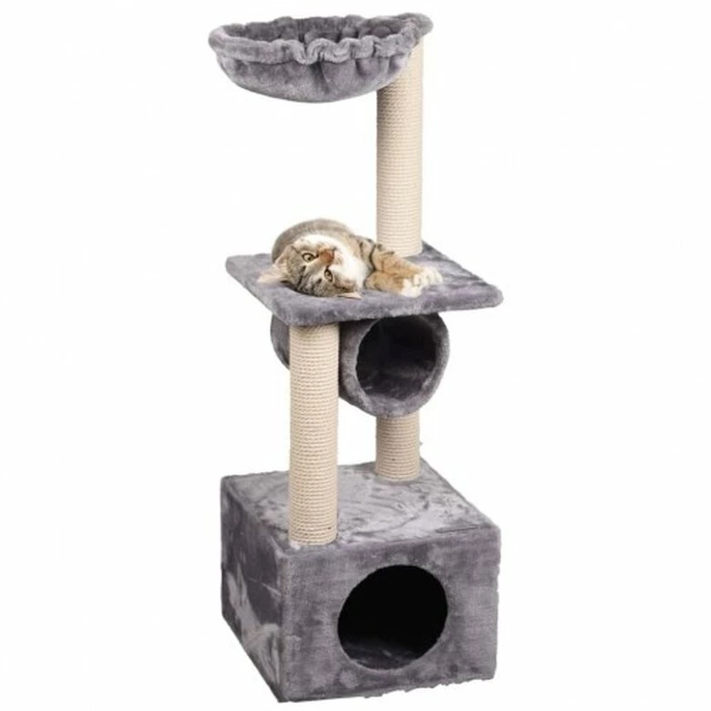 Este árbol para gatos está hecho de MDF y está tapizado con tela de poliéster suave, y combina bien con la decoración de cualquier habitación gracias a su aspecto gris contemporáneo.