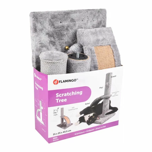 Este accesorio de Flamingo está elaborado con materiales de alta calidad para mayor durabilidad. La primera planta está forrada de felpa muy suave para proporcionar un gran confort y la segunda tiene un poste de sisal, con una pelota colgante con sonido de cascabel para incitar al juego. Cuenta con una rampa medio arco tipo puente con una estera raspadora de yute donde podrá afilar sus uñas y estirarse.
