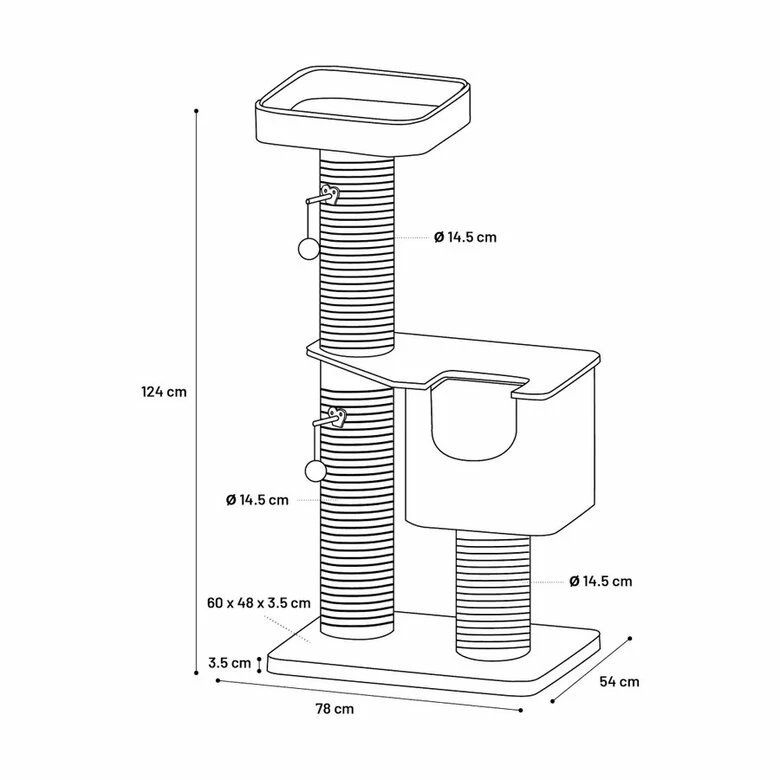 Incluye dos pelotas colgantes para que intente atraparlas y las patee, de esta forma, se mantendrá en constante ejercicio y muy activo. Los materiales utilizados para su fabricación son de alta calidad para una gran durabilidad. Todo el rascador está envuelto en una suave y delicada felpa que a tu gato le encantará tocar y sentirla para descansar. Un fantástico árbol donde tus felinos podrán hacer lo que más les gusta y jamás se bajarán.