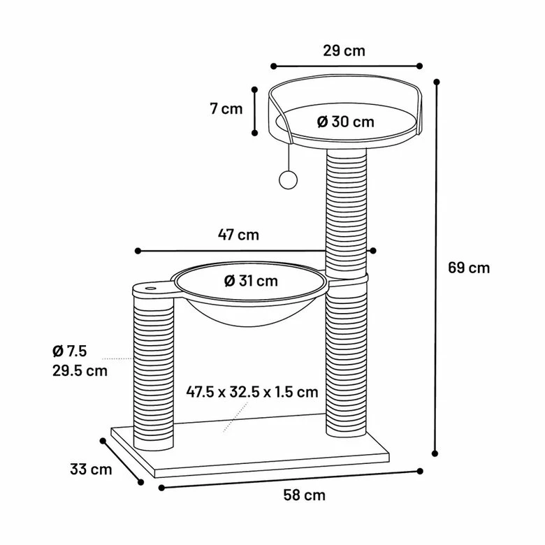 Además, tiene una hamaca donde tu felino puede acostarse y tomar una siesta. También en la parte superior una cama con un juguete colgante para que tu minino pueda entretenerse. Su diseño y tamaño permite que pueda estar en cualquier rincón de tu casa sin ocupar mucho espacio.