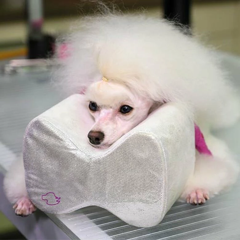 La almohada Ibáñez de memory foam facilita la relajación y el descanso de los perros mientras se les trabaja los arreglos del pelo de cabeza y nuca.