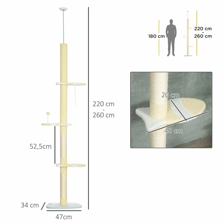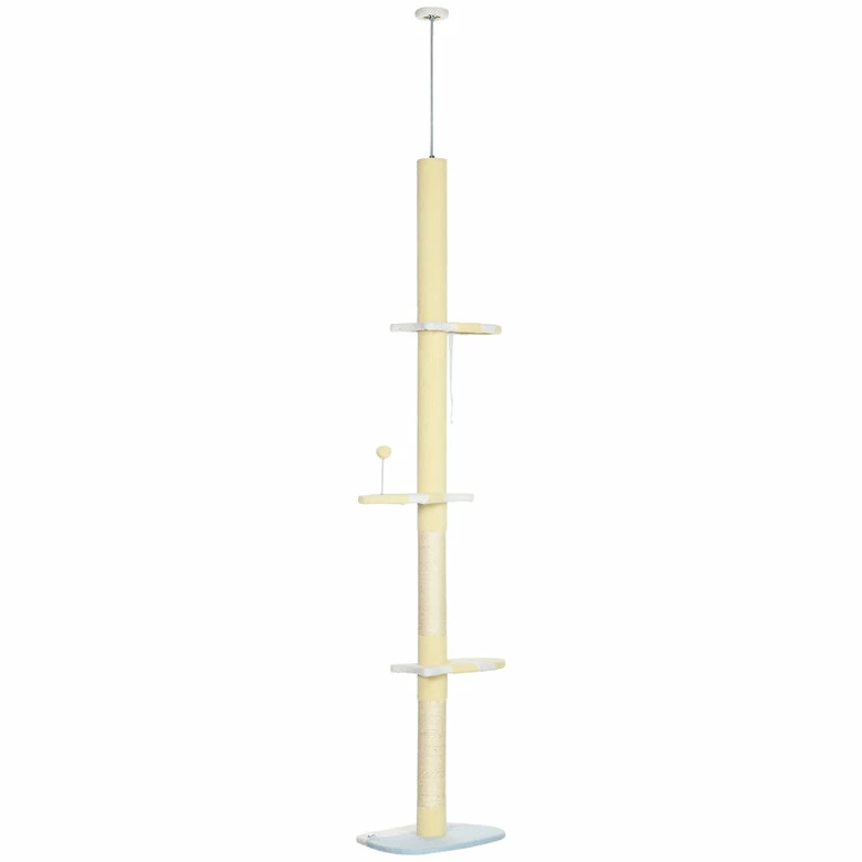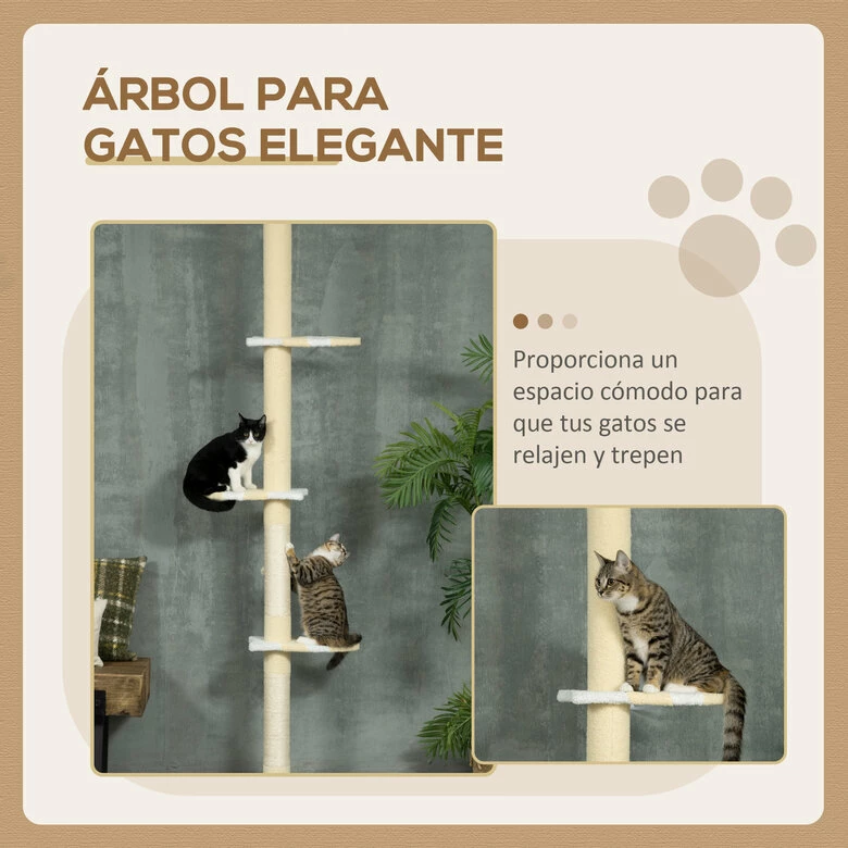 Ahorrar espacio y ofrecer una amplia superficie para que tus gatos jueguen o descansen es posible con los rascadores de suelo a techo de PawHut. Se pueden ajustar a techos de entre 220-260 cm de altura, ofreciendo una gran estabilidad y mayor seguridad para tu mascota, incluso si tu gato es muy activo. Hecho de aglomerado de madera, se compone por múltiples plataformas, 1 bola de juguete con resorte y 2 tramos de poste de sisal para poder afilar sus garras. Árbol para gatos grandes para ajustar en techos de entre 220-260 cm de altura. Este tipo de rascadores permiten ahorrar mucho espacio en el suelo al obtenerlo en altura con las múltiples plataformas. Se puede fijar al techo con la barra de tensión incluida. Los postes de cuerda de sisal satisfacen la necesidad de arañar y cavar de tus gatos. Estructura de aglomerado de madera, resistente y estable. El tapizado con felpa, ofrece a tu gato un espacio cálido y suave para jugar y descansar. Pelota con resorte de juguete para mayor entretenimiento de tu mascota. Apto para gatos con un peso inferior a 5 kg. Se requiere montaje.