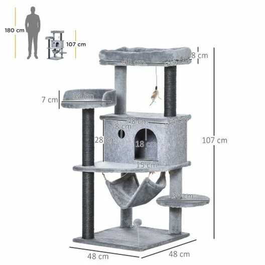 - Incluye 4 perchas, 1 casa, 1 hamaca, 1 cama superior, 1 juguete colgante, 1 bola con muelle y postes de sisal.