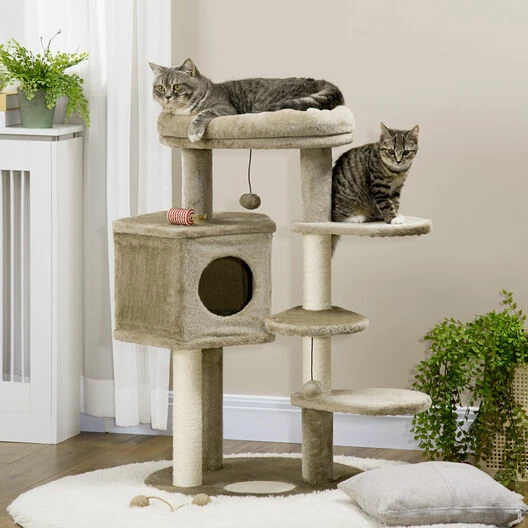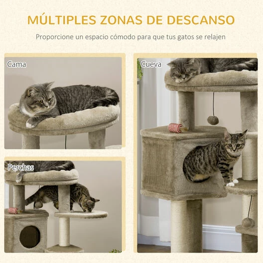 Satisface los instintos naturales de tu gato de forma segura con este árbol para gatos con juguetes de PawHut. Este rascador para gatos incluye postes de cuerda de sisal para mantener tus muebles libres de rasguños, ya que en él podrán afilar sus garras. También tiene dos bolas colgantes y una pelota para que se entretengan. Dale a tus juguetones felinos un lugar seguro donde, además de afilar sus garras, puedan jugar, descansar o dormir. Los postes de cuerda de sisal satisfacen la necesidad de arañar y cavar de tus gatos. Árbol para gatos con estructura resistente y estable de aglomerado de madera. Incluye bolas colgantes y pelota para mayor entretenimiento y diversión de tu mascota. Gracias a su diseño y tonos neutros complementará la decoración de tu hogar sin alterarla. El diseño de varios niveles satisface el deseo de escalar de tu mascota. Apto para gatos de menos de 6 kg. Se requiere montaje.