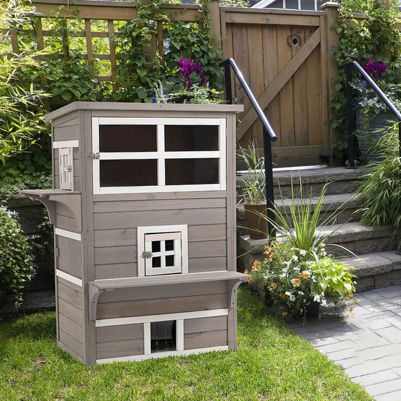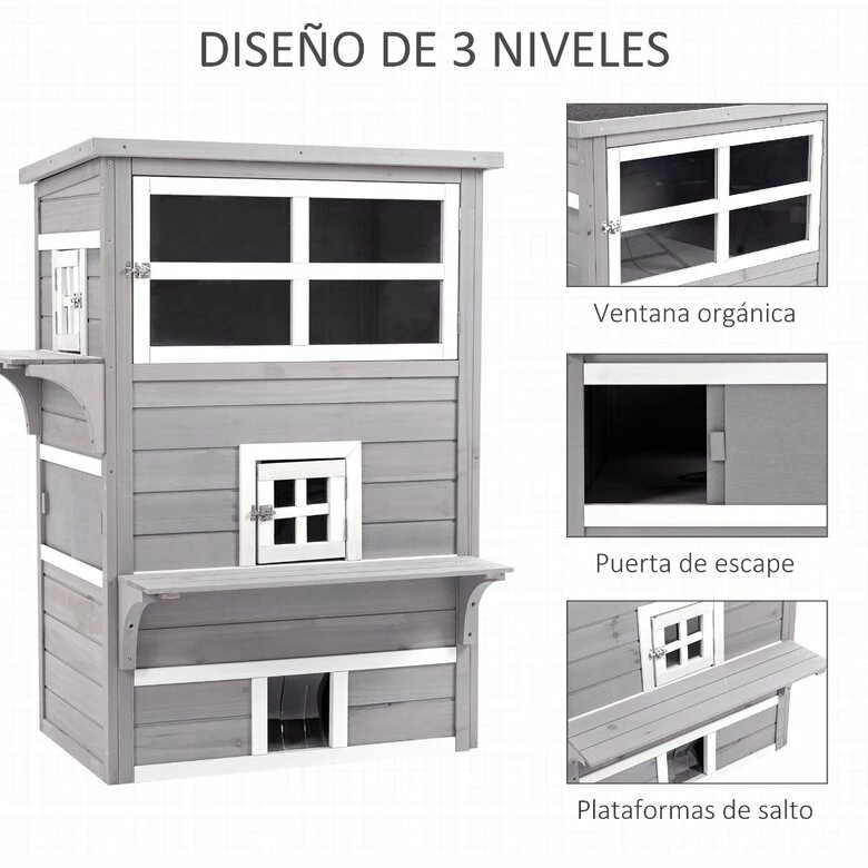 ¿Necesitas espacio para tus felinos? La caseta para gatos de PawHut lo hace posible, ya que cuenta con 3 pisos, lo que la hace perfecta para las mascotas. Tiene puertas y ventanas de acceso, orificios que conectan los distintos niveles en el interior y las plataformas de salto exteriores.