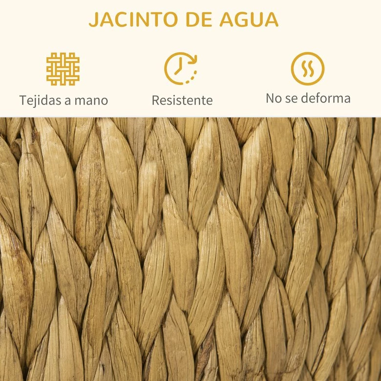- Está fabricada con jacinto de agua, metal, franela, algodón PP y madera de paulonia.