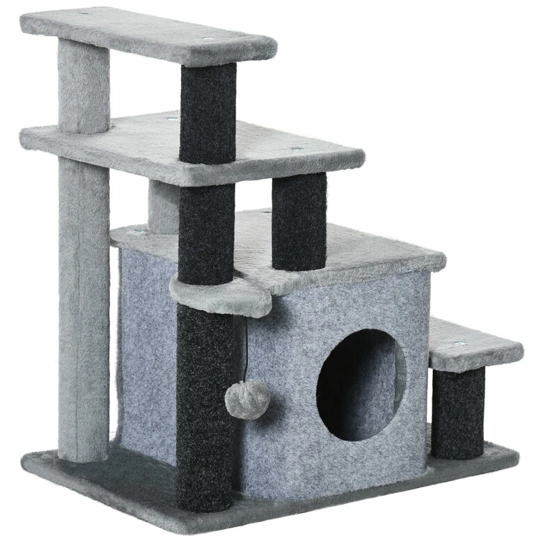 ¿Sabes que permitir que las mascotas suban y bajen de la cama puede causarles dolores en las articulaciones y las rodillas? Especialmente para las mascotas mayores o con problemas de movilidad. Entrenar a tus mascotas para que utilicen los peldaños para la cama podría ser una gran ayuda para salvar desniveles como los que suponen subir a la cama o el sofá. Además, esta escalera de PawHut cuenta con una cueva para que puedan descansar y una bola colgante para entretenerse. Altura ajustable, peldaños para gatos de 3/4 pasos para gatos mayores que aplican la mayor altura de la cama o el sofá. Apoya su paso si están envejeciendo, son de baja estatura o están lesionados. Diseño especial para que las mascotas jueguen o duerman y disfruten de su tiempo sin ser molestadas. Incluye una bola colgante para que tus mascotas puedan divertirse. Recomendado para gatos de hasta 5 kg. Se requiere montaje.