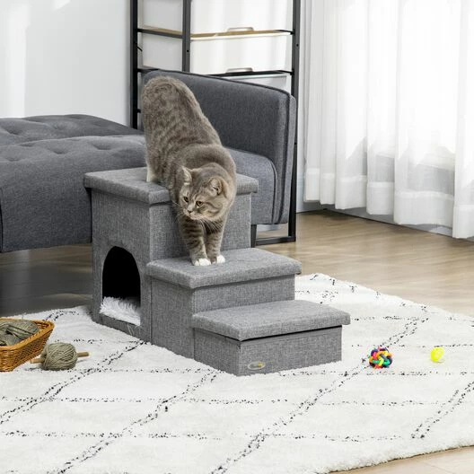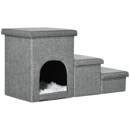 ¿Sabías que permitir que los animales domésticos suban y bajen puede causar dolor en las articulaciones y las rodillas? Especialmente para animales domésticos mayores o con problemas de movilidad. Por eso, esta escalera para mascotas de PawHut es ideal. Además de ser una práctica escalera, también ofrece un amplio espacio de almacenamiento y una cómoda casita para que tu amigo peludo descanse o tome una siesta. Características – Escalera para mascotas de 3 peldaños, ideal para mascotas de edad avanzada o con problemas de movilidad – También cuenta con amplio espacio de almacenamiento y una acogedora casita – El interior de la casa tiene un cojín suave para mayor comodidad – El cojín es extraíble para facilitar su limpieza – La casa tiene un orificio para facilitar la entrada y salida de tu mascota – Adecuado para mascotas que pesen menos de 5 kg – Requiere montaje fácil y rápido