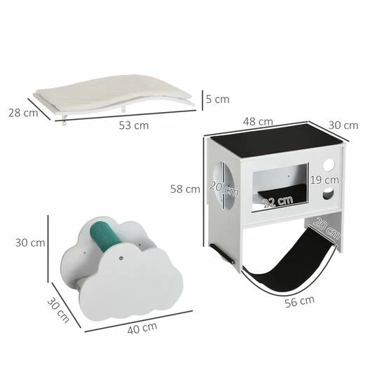 – Medidas de los cojines: 28 cm x 24 cm x 1 cm (cueva), 49 cm x 28 cm x 1 cm (estante curvo) y 28 cm x 28 cm x 1 cm (estante nube)