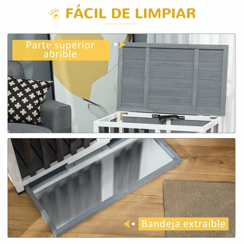 ¿Necesitas un recinto para mantener a salvo a tu amigo de cuatro patas? Esta jaula para perros de MDF está diseñada para proteger a tu mascota y, además, también se puede usar como una mesa auxiliar para almacenar suministros. Su marco de madera con pintura natural es resistente y duradero, lo que garantiza que los perros estén protegidos cuando estén dentro. La puerta tiene pestillo, así que puedes salir de la habitación sabiendo que no se escaparán. Características: Se puede utilizar como jaula para perros y como mesa auxiliar Madera de abeto repintada Estructura plegable para facilitar su almacenaje con asa para poder llevar cómodamente a todas partes Parte superior que se puede abrir para facilitar el acceso Rejilla inferior y bandeja extraíbles para facilitar la limpieza Base elevada para mantener al animal alejado de la humedad Adecuado para perros medianos, pequeños y miniatura de menos de 15 kg No requiere montaje (solo es necesario instalar el pestillo de la puerta) Especificaciones: Color: gris, blanco Material: madera de abeto Medidas totales: 84,5×51,4×61 cm (LxANxAL) Tamaño plegado: 84,5x59x14 cm (LxANxAL) Medidas de la puerta: 28×46 cm (LxAN) Medidas de la ventana: 42×47 cm (LxAN) Medidas de la bandeja: 73×45 cm (LxAN) Distancia entre barrotes: 5 cm (puerta), 4,5 cm (ventana) Referencia: D02-033V01