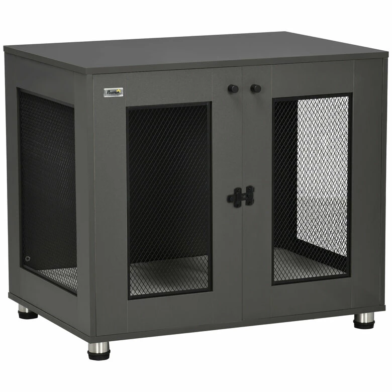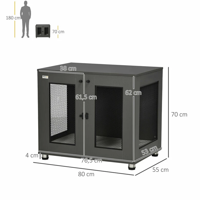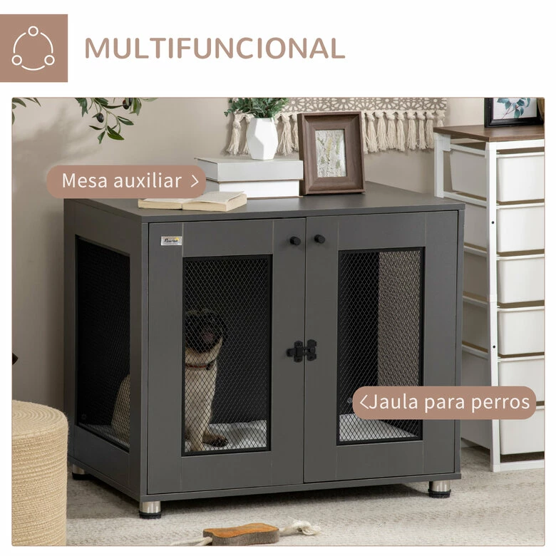 ¿Estás buscando un lugar para que tu mascota descanse? Esta refugio para perros interior todo en uno de PawHut es ideal. Gracias a su diseño multifuncional, se puede utilizar como mesa auxiliar o como una cómoda casa para perros. Tiene una almohadilla que se puede quitar y lavar. Fabricada en metal y melamina de madera, esta jaula tiene una base elevada para mantener a tus amigos de cuatro patas alejados de la humedad. Diseño 2 en 1, se puede usar a modo de caseta o casa para perros interior. La parte superior de la jaula es grande para que puedas colocar productos para mascotas en ella o de uso diario a modo de encimera. La puerta doble facilita la entrada y la salida de tu mascota. Incluye una suave y cómoda almohadilla extraíble y lavable. La base elevada mantiene a tus mascotas alejadas de la humedad. El pestillo de seguridad permite mantener la jaula cerrada cuando sea necesario. Pies ajustables para mantener el producto estable incluso en suelos con alguna irregularidad. Adecuado para perros medianos de hasta 20 kg y máximo 50 cm de longitud corporal. Requiere montaje.