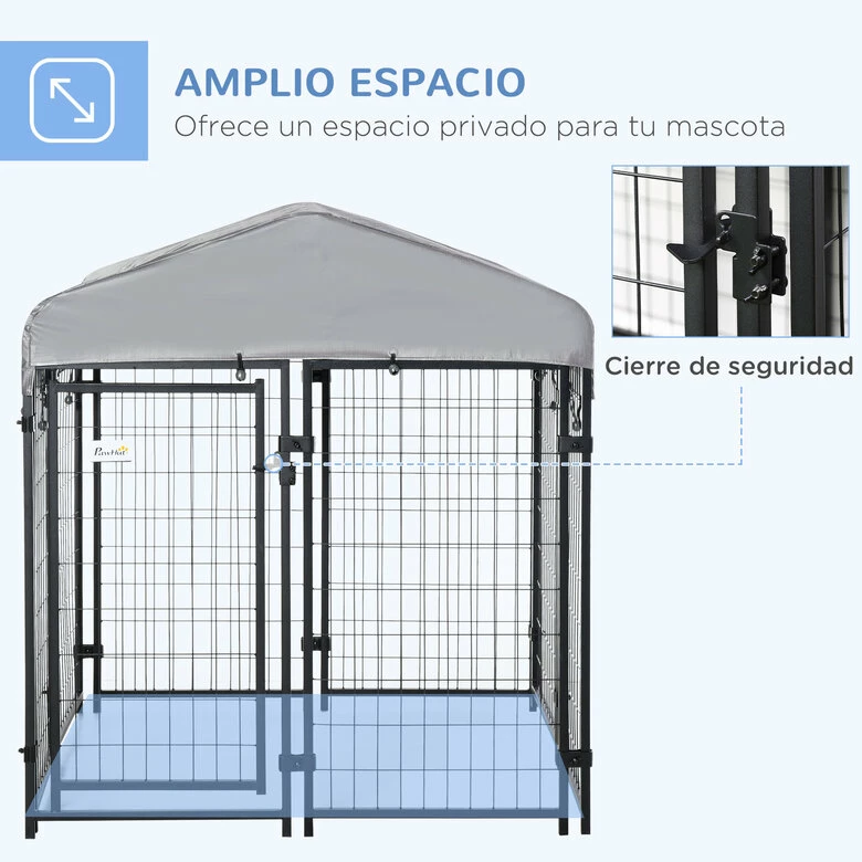 A veces las circunstancias nos obligan a mantener a nuestras mascotas enjauladas, y en muchas ocasiones únicamente por su bienestar y seguridad. En estos casos una buena jaula puede ser una buena solución para que no se sientan atadas como tal. Y es por eso, que PawHut ofrece productos como esta perrera con toldo pensada tanto para interiores como exteriores. Con espacio suficiente para moverse y un toldo para protegerlas del sol o la lluvia ligera. Toldo de tejido de PE resistente a la intemperie, con protección UV y repelente al agua.