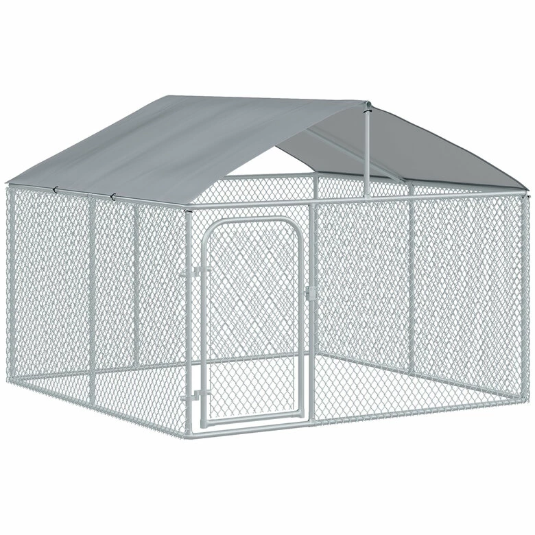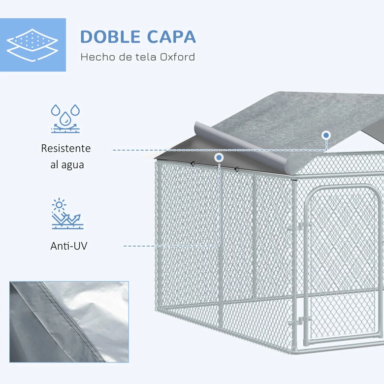 Mantén a tu perro seguro incluso cuando no estés en casa con este recinto exterior de PawHut. Fabricado con malla galvanizada y dotado de un toldo de tela impermeable y resistente a los rayos UV, es perfecto para resguardar a tu amigo de cuatro patas de las inclemencias del tiempo y del sol. Resistente y funcional, tiene una puerta con cerradura para que puedas tener a tu perro en un espacio seguro y tranquilo en todo momento. Amplio espacio para que tus perros jueguen o descansen. Estructura de metal galvanizado resistente, perfecto para uso diario en exteriores. Con un toldo de tela Oxford, impermeable y resistente a los rayos UV. La puerta permite un fácil acceso al interior y cuenta con cerradura para mayor seguridad. Adecuado para perros, conejos, patos y otros animales de tamaño mediano. Se requiere montaje.