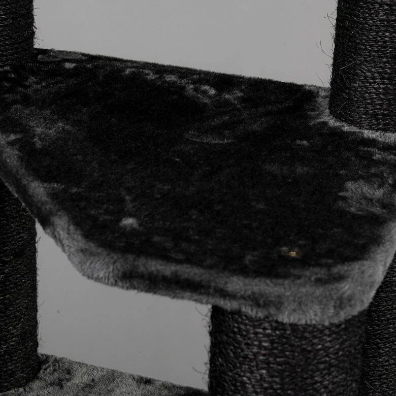 - El rascador tiene una gran placa de fondo extra robusto y una escalera en la parte inferior cubierta con tela de sisal para rascar.