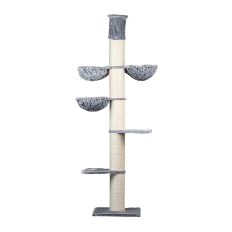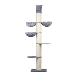El rascador Maine Coon Tower PLUS es un rascador con altura de techo (de 245 a 265 cm, ajustable contra su techo) con polos de sisal de 20 cm de espesor y hamacas grandes con una cama grande de 45 cm que puede cargar fácilmente 20 kg.