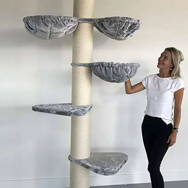 - Usted puede usar este rascador Maine Coon Tower PLUS de múltiples maneras y usted decide dónde vienen los grandes escalones y las hamacas.