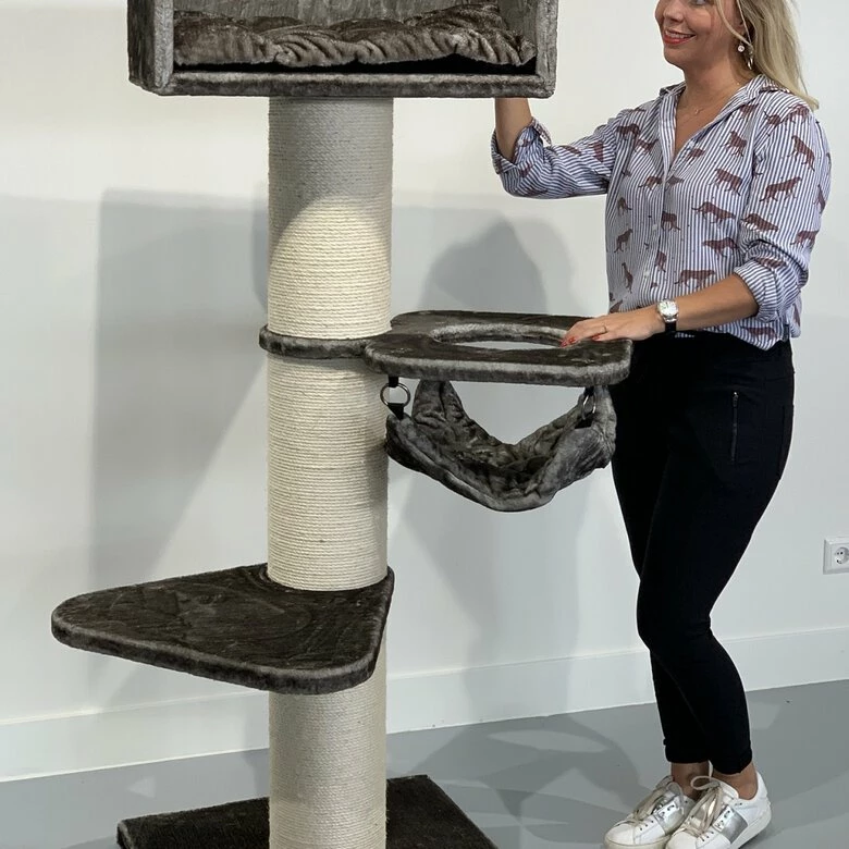 Debido a su altura de 157 cm, un rascador ideal para su sala de estar y un lugar de observación y relajación ideal para su gato.