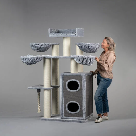 Este rascador grande y robusto está diseñado pensado expresamente para que los gatos de razas más grandes puedan divertirse y descansar en el mismo lugar, sintiendose cómodos y seguros. Fabricado con los materiales de mejor calidad. ¡Tu gran gato se merece un espacio a su nivel, dale lo que se merece!