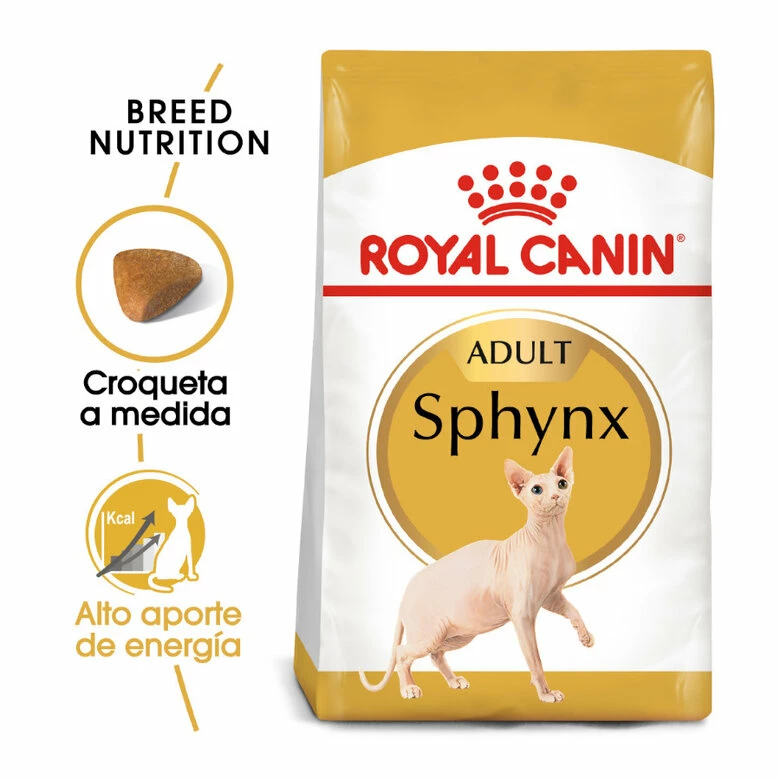 Para compensar la ausencia de pelo, el Sphynx tiene un metabolismo muy activo que le ayuda a regular su temperatura corporal. El pienso para gatos Sphynx Adult de Royal Canin posee una fórmula muy calórica que aporta un contenido elevado de grasas (23 %) para cubrir las necesidades especiales de esta raza.