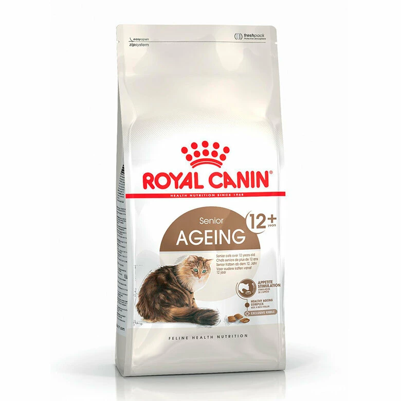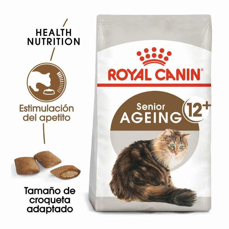 Royal Canin Feline Ageing +12 es un alimento que ayuda a cuidar las articulaciones de su mascota y a mantener su peso óptimo, estimulando su apetito caprichoso gracias a una croqueta innovadora con dos texturas.