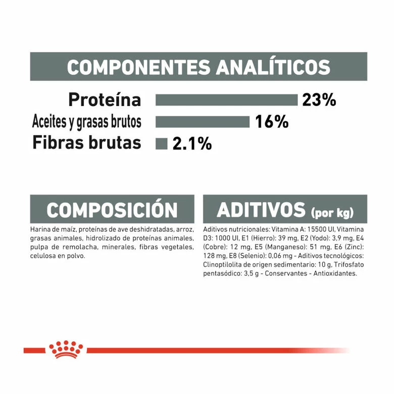 Harina de maíz, proteínas de ave deshidratadas, arroz, grasas animales, hidrolizado de proteínas animales, pulpa de remolacha, minerales, fibras vegetales, celulosa en polvo.