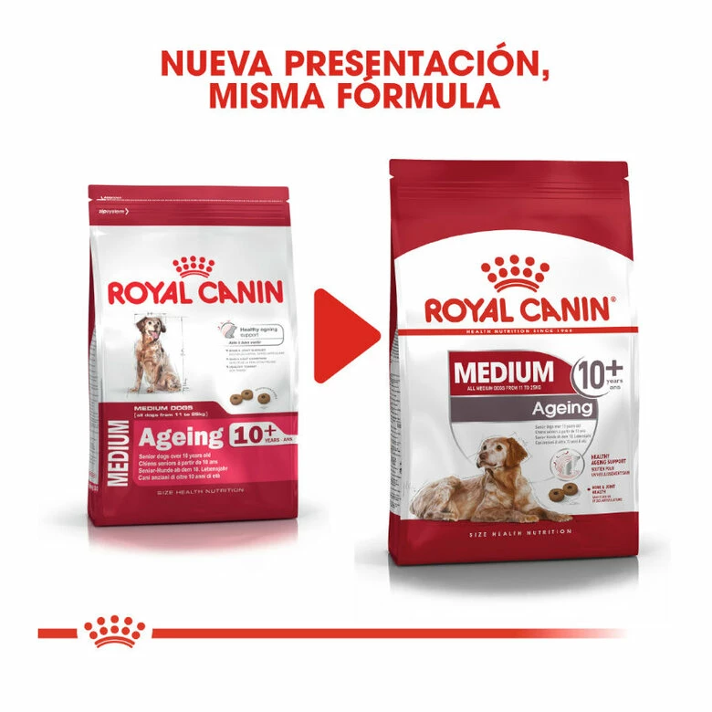 Los caninos adultos de tamaños medios (entre 11 kg y 25 kg de peso adulto) a partir de los 10 años tienen en esta fórmula el alimento ideal. Royal Canin Medium Ageing 10 contiene una serie de nutrientes esenciales y antioxidantes para que los perros mayores tengan un envejecimiento saludable.