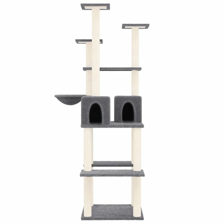 ¡Con este rascador para gatos, tus peludos amigos podrán disfrutar del lujo! Tus gatos disfrutarán arañando, trepando, posándose, escondiéndose y descansando en él. Torre para gatos todo en uno: El rascador para gatos de varios niveles brinda a tu gato un lugar divertido y compacto para jugar, hacer ejercicio y una casa acogedora para echar una buena siesta. Cuenta con 2 casas, una hamaca y plataformas.Felpa cómoda: La felpa extragruesa y suave del poste rascador está bien ventilada, es resistente a los arañazos, comodísima y acogedora.Duraderos postes de sisal: Los resilientes y fuertes postes de sisal natural del árbol rascador son perfectos para que tus amados gatos satisfagan su instinto de arañar y evitar así que arañen los muebles.Prácticas casitas: Las pequeñas casas del rascador permiten que los gatos descansen y duerman sin ser molestados.Acogedor cesto: El cesto de la torre rascador permite que los gatos se acurruquen cómodamente en la tela, como si estuvieran en una nube. Nota: La lona impermeable no está incluida. Cada producto viene con un manual de montaje en la caja para facilitar el montaje.