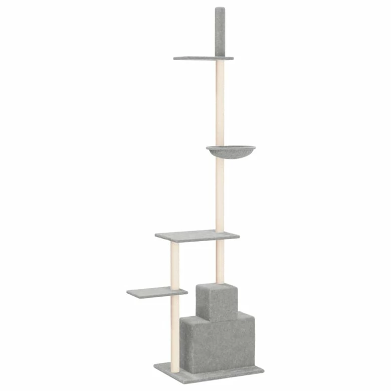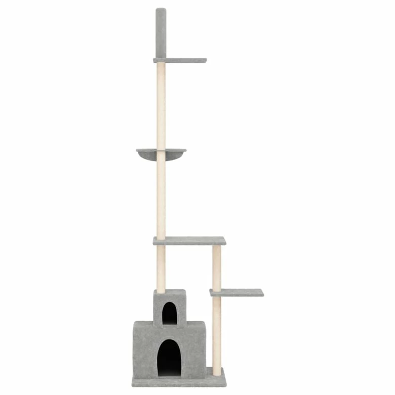 ¡Mantén entretenidos a tus adorables gatos sin parar con este rascador para gatos todo en uno! Torre para gatos todo en uno: El mueble para gatos con varios niveles está diseñado con 2 casas, 1 hamaca y plataformas, por lo que proporciona un lugar perfecto para que tus gatos trepen, se posen, arañen, se escondan y también se relajen.Material de felpa suave: La felpa extragruesa y suave está bien ventilada, es resistente a los arañazos, comodísima y acogedora.Postes de sisal natural: Los resilientes y fuertes postes de sisal natural del árbol rascador son perfectos para que tus amados gatos satisfagan su instinto de arañar y evitar así que arañen los muebles.Diseño práctico: Con el poste ajustable, el centro de actividades para gatos se puede fijar al techo, y su altura se puede ajustar de 250,5 a 276,5 cm. Nota:Cada producto viene con un manual de montaje en la caja para facilitar el montaje.