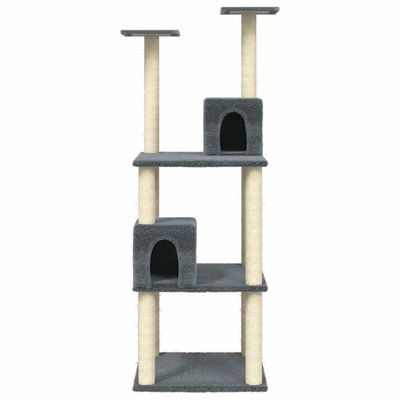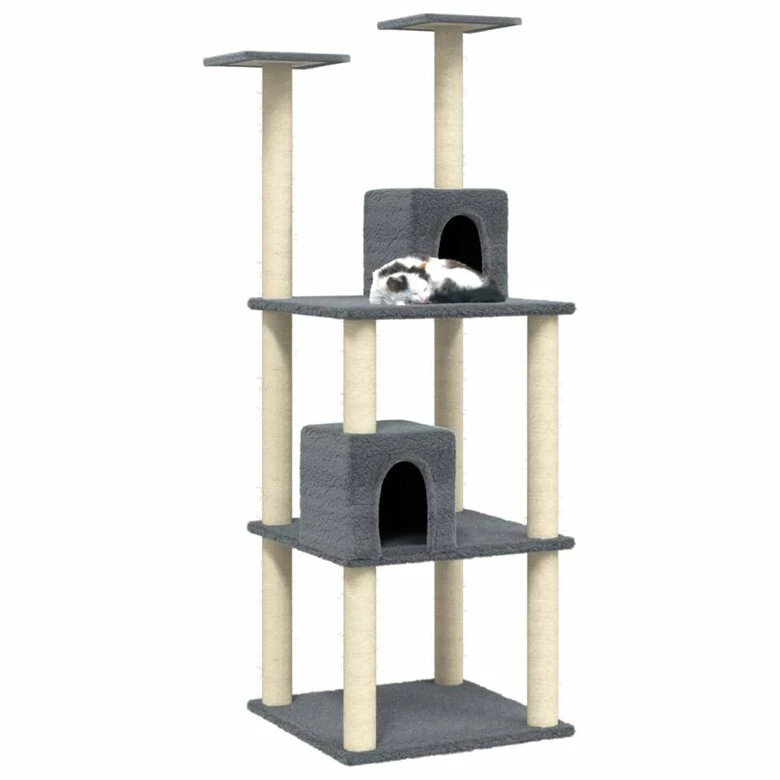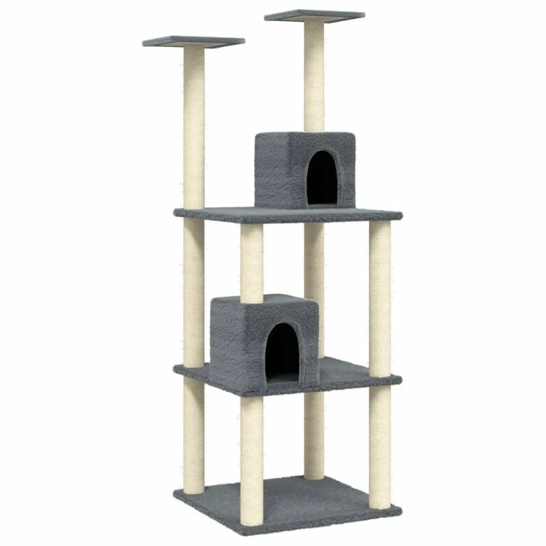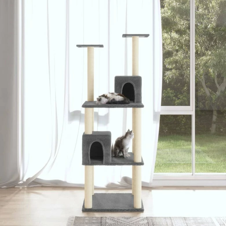 Este rascador para gatos es perfecto para que tus gatos se rasquen, trepen, se encaramen, se escondan y descansen. Da a tus gatos la oportunidad de estirarse y ejercitarse, en especial en los meses fríos de invierno cuando están atrapados dentro de casa. Los resilientes y fuertes postes de sisal natural son perfectos para que tus amados gatos satisfagan su instinto de arañar y evitar así que arañen los muebles. Se lo pasarán bien al perseguirse unos a otros mientras saltan arriba y abajo en este divertido centro de juegos. Cuando hayan disfrutado lo suficiente, tus pequeños amigos amarán descansar en las plataformas superiores donde tienen mejores vistas. La casa permite a tus gatos descansar y dormir sin interrupciones. Requiere montaje. ¡A tu gato le encantará jugar en este precioso rascador!